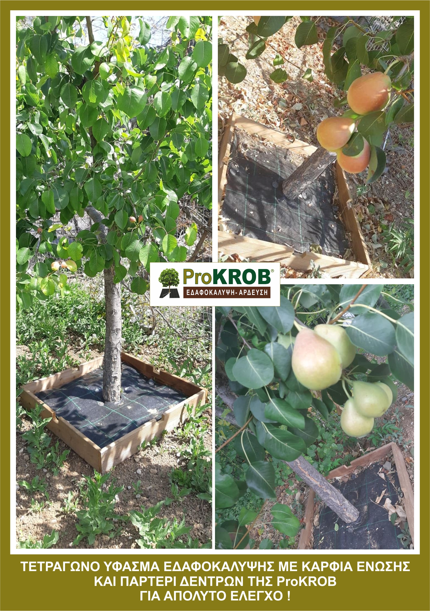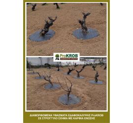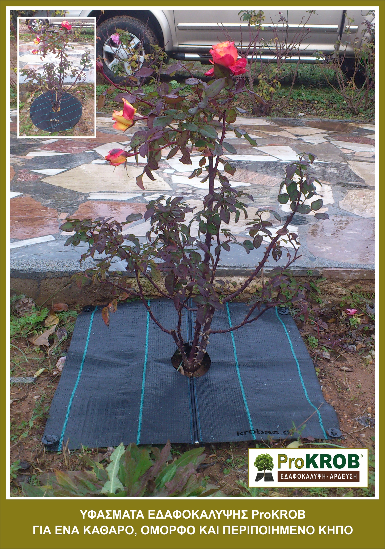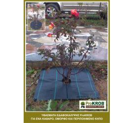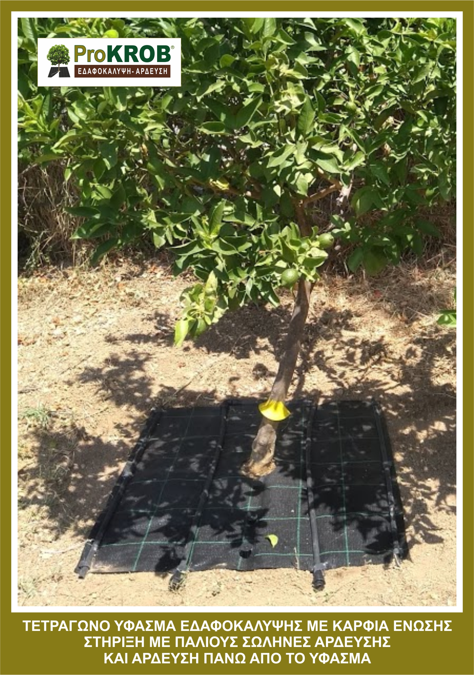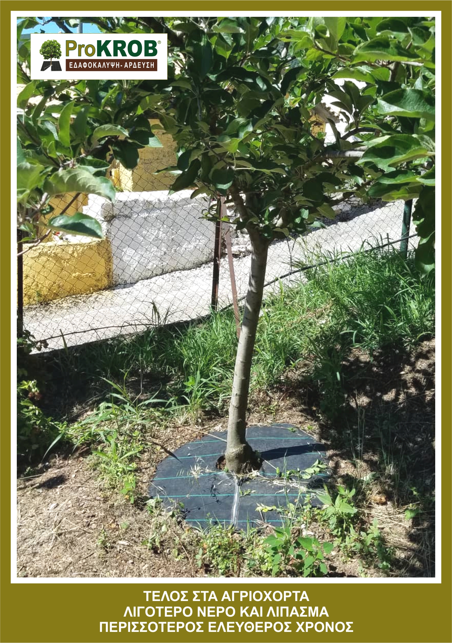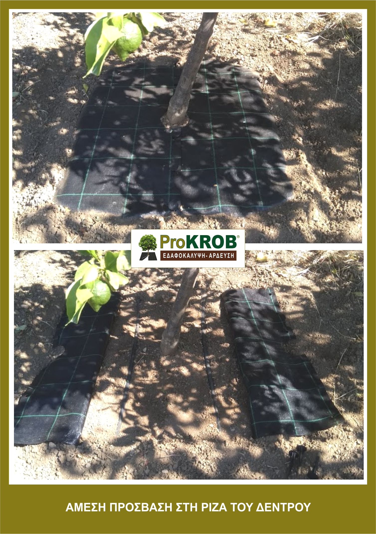 To ύφασμα εδαφοκάλυψης της PRO KROB παράγεται σε διαφορετικές διαστάσεις και διαφορετικά σχήματα, τετράγωνα ή στρογγυλά, για την ατομική προστασία του φυτού ή του δέντρου. Το μεγάλο, όμως, πλεονέκτημα στο ύφασμα της PRO KROB είναι ότι προσαρμόζονται δύο φερμουάρ που βοηθούν αφ’ ενός μεν στη τοποθέτηση γύρω από τη ρίζα του φυτού ή τον κορμό του δέντρου και αφ’ ετέρου στην εύκολη πρόσβαση, άνοιγμα – κλείσιμο, για κάθε είδους εργασία. (πχ. παροχή λιπάσματος) Έτσι μας επιτρέπει επανειλημμένες μελλοντικές χρήσεις. Για τη στήριξή του στο έδαφος το ύφασμα εδαφοκάλυψης της PRO KROB φέρει περιμετρικά συγκεκριμένες οπές, μέσω των οποίων διέρχονται τα καρφιά της στήριξης. Μ’ αυτόν τον τρόπο επιτυγχάνουμε την ασφαλή και σταθερή τοποθέτησή του. Η γκάμα των διαστάσεων της PRO KROB καλύπτει σχεδόν όλες τις ανάγκες, από ένα θάμνο μιας τριανταφυλλιάς …. Έως τον κορμό μιας καρυδιάς.